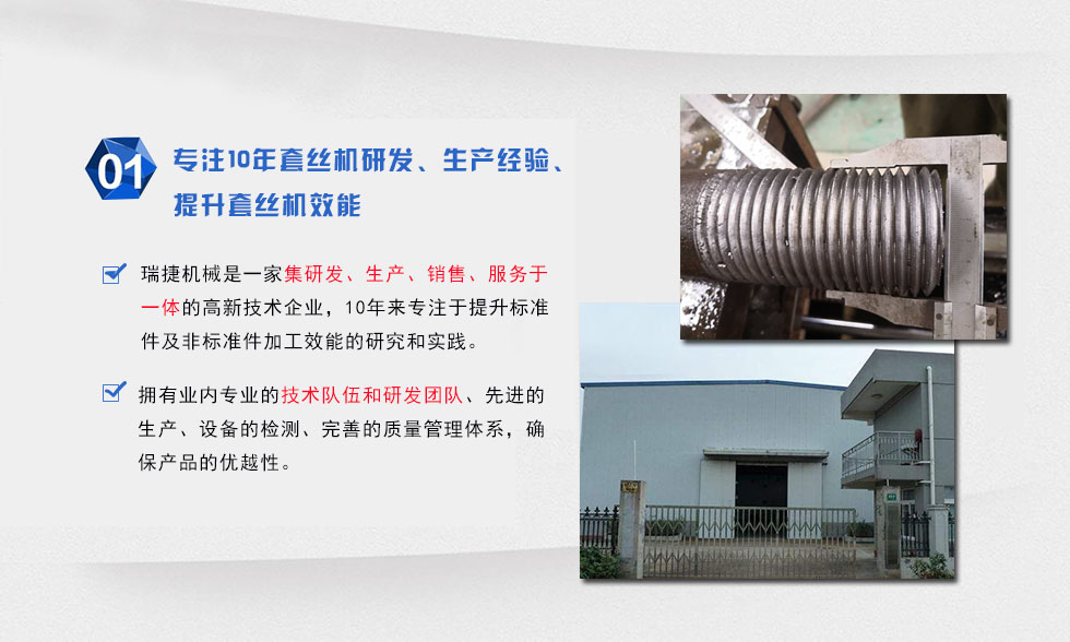 邢台市瑞捷机械制造有限公司专业生产圆钢套丝机,钢管套丝机两大系列,其特点主要展现为机头的优化改进,大幅度提高了加工螺纹丝头的精确度和工作效率,有效解决了本行业在加工丝扣上端部易扭转变形(丝扣加易扩口)、配件损耗高、加工效率低的技术难题。